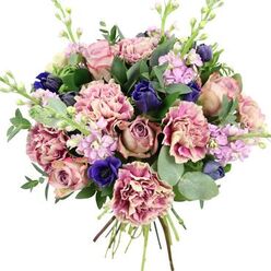 Our Enchanting Garden Arrangement is a visual masterpiece featuring stunning blue hydrangeas, light purple roses, green lisianthus, white spray roses, Ammi visnaga, pink bouvardia, and pink astilbe. This unique combination creates a captivating bouquet that radiates elegance and charm.