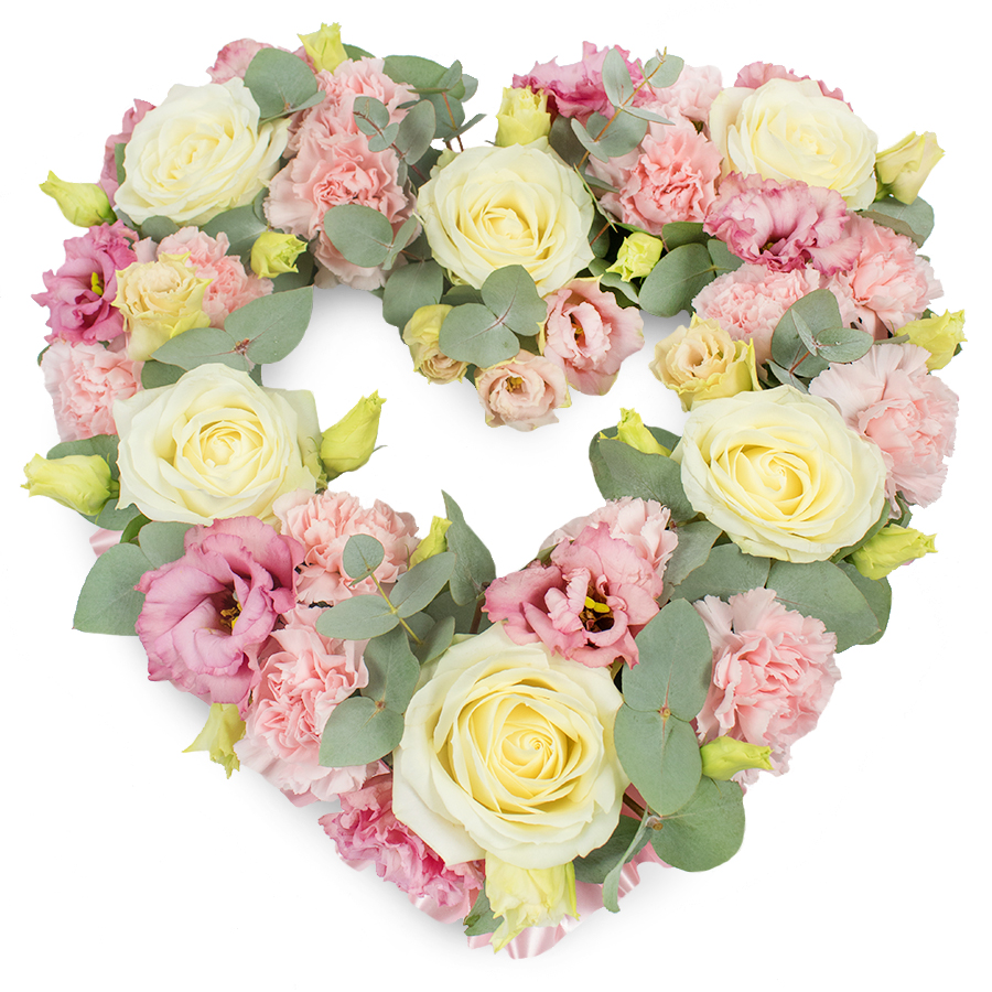 Pay your respects with our Elegant Open Heart Memorial Bouquet. This heartfelt arrangement features a beautiful combination of white roses, pink carnations, pink lisianthus, and eucalyptus leaves, artfully arranged in an open heart shape to symbolize love and remembrance.