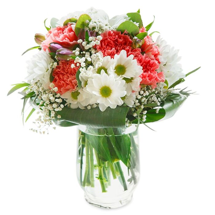 Send a luxurious bouquet that speaks volumes. Our arrangement features a stunning blend of snow-white chrysanthemums, tender gypsophila, and light pink carnations, beautifully wrapped in rich aspidistra leaves for a sophisticated touch.